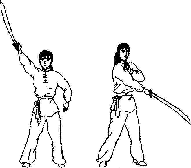 开步站立。右手举刀于右斜上方,向左斜下方斜劈,力达 刀刃前部;同时左手弯曲合于右肩旁。目视刀尖。(图2~6、图 2-7)