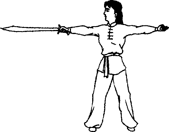 右手握刀,两臂侧平举,以腕 为轴,刀在臂两侧由下向上贴身 划立圆撩绕。如开步撩腕花(图 2-29) o(二十二)剪腕花右手握刀,两臂侧平举,以腕 为轴,刀在臂两侧向下贴身划立 圆剪绕。如开步剪腕花(图2-30) o图 2-30