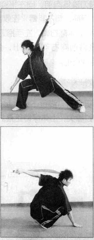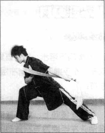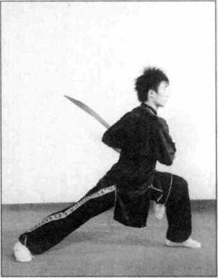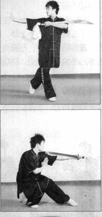 (2) 右脚向下落步,左脚向左落 步,两腿屈膝半蹲,同时右臂屈肘 收至身背后,手心向外,左手抱刀 屈肘收于右肩前,目视右前方;