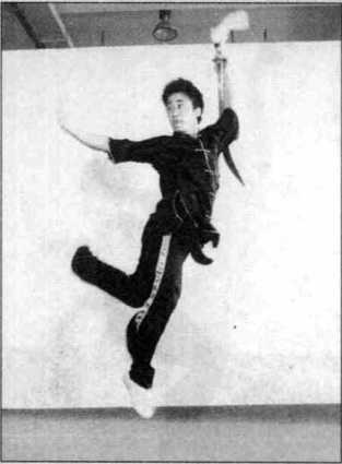 (2) 左手抱刀直臂向前上方立 园摆动,右臂直臂向下摆动;