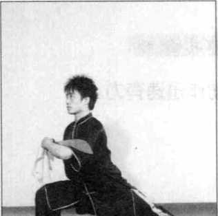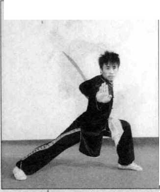 (2) 右腿屈膝半蹲,左脚向左 落步,脚尖点地呈虚步,左手抱刀 向下经腹前向左直臂摆至与肩同 高,虎口向上,右臂向下经腹前向 左上方摆动,右掌置于左臂内侧, 指尖向上,目视前方。