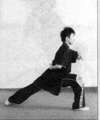 (3) 身体左转,左脚尖外展,左 腿屈膝半蹲,右膝伸直呈左弓步,