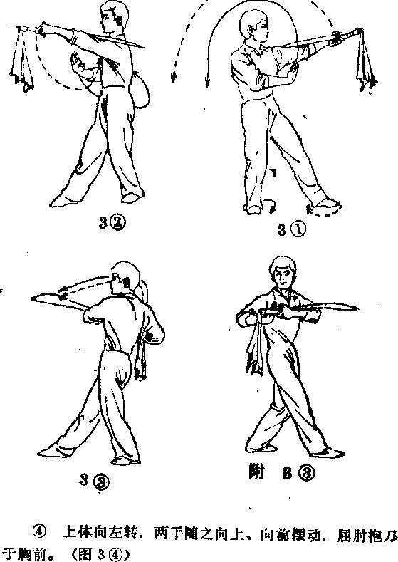③ 上林向右拧转’两手随之向下、向右摆动,左营屈 射推刀收于右胸前,右手按于刀柄上,目视右前方」图3③、 圈3③〉