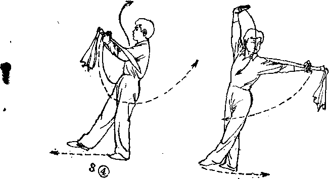 ② 出耕转,重心移至左麒,右脚尖点地,两手向上 经头前上方至身体右前方,左手抱为平伸,右手落至 左臂内瓣,掌心拘左,目挽右前方寸(图3由D