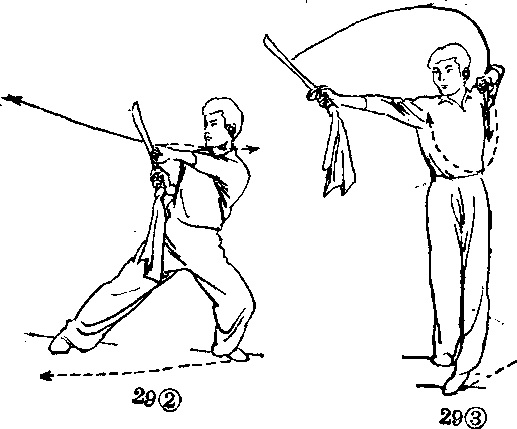 ?上体左转,重心移至右腿.左脚向右脚前方上步, 鹏尖点地成前点步右手持刀直骨向右推出,左手屈肘回带 盘于左倒,拳与肩同高,拳心向前目视右前方M图29⑧)