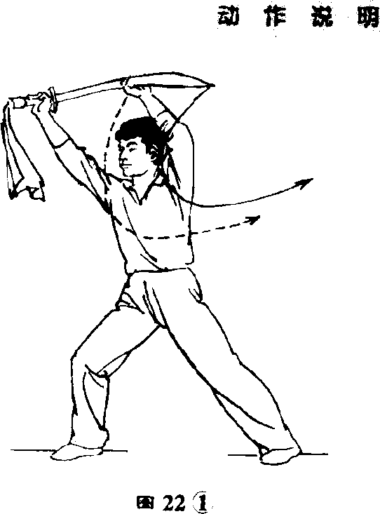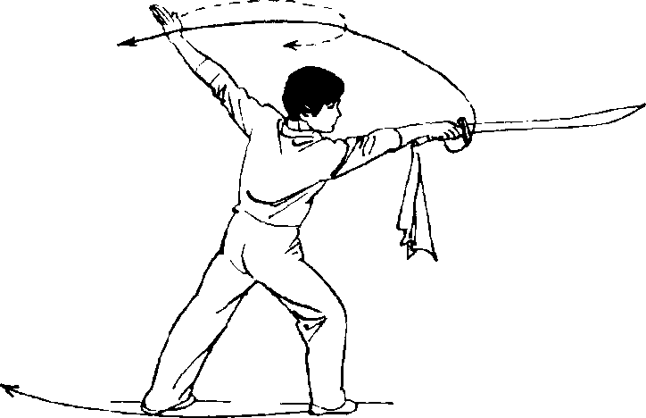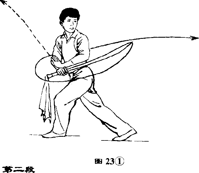 左手收回,掌心贴靠刀背,刀刃向 上,刀尖向左;目视右前方◎(