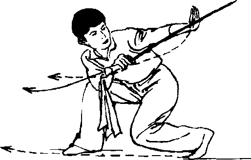 腰部向左后方拧转,两脚树磨 地面同时换位;右手持刀向右前方 立刀扎出,左手向左侧直臂伸出;