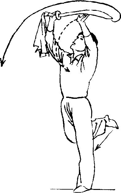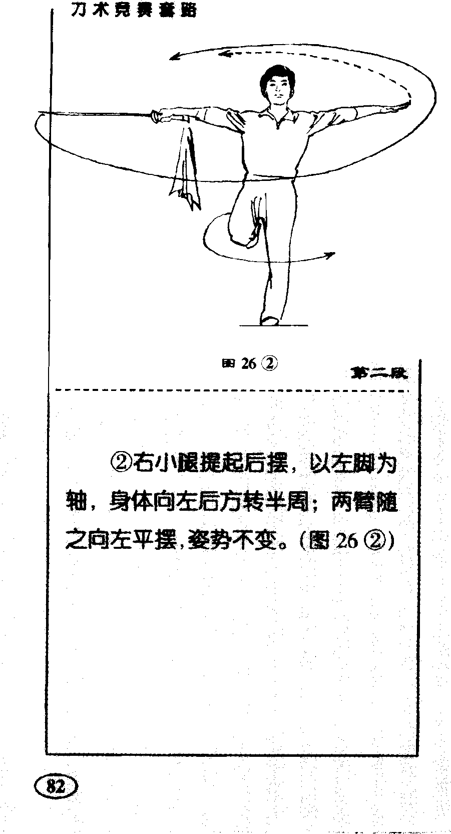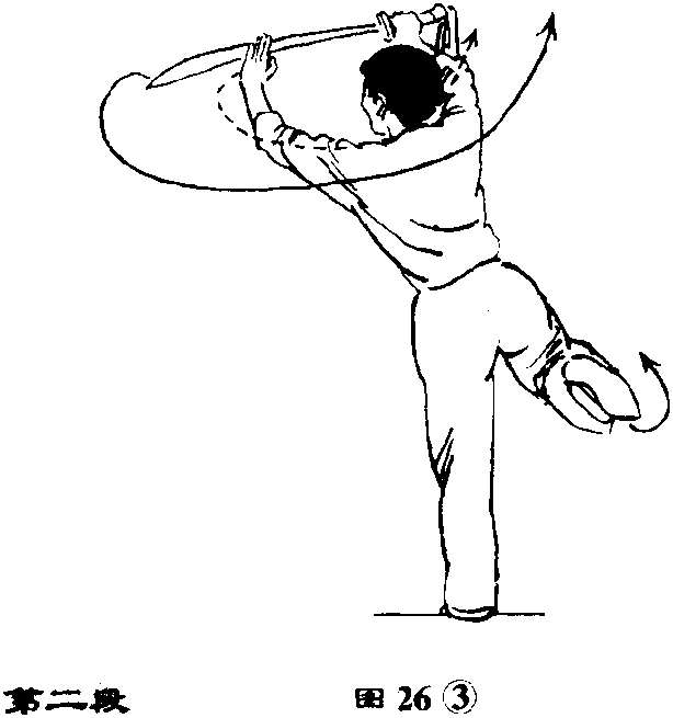 ④上体左转并后仰;右手持刀 以腕为轴,在头上方成水平向左、 向后绕行半周,刀刃向上,刀尖向 后,左手随刀绕行;目视刀身。(图 26④)