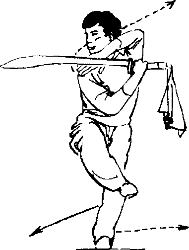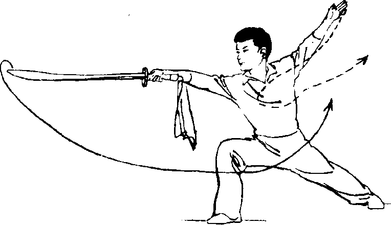①身体向右后方转咿周两 脚随之碾转;左手先向到》伸开; 手心向下,然后两卿锻体向左平 摆,右手持刀刀尖时,刀刃向后;
