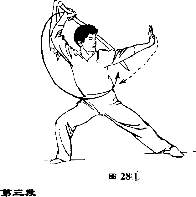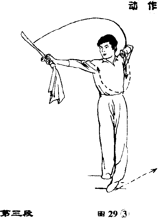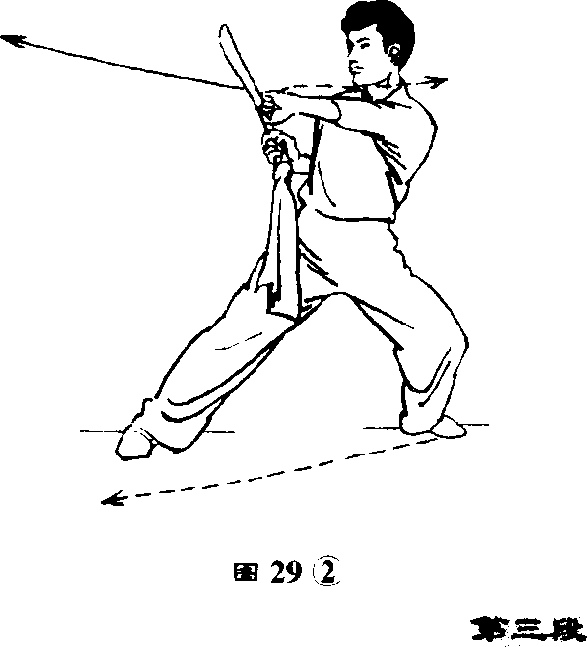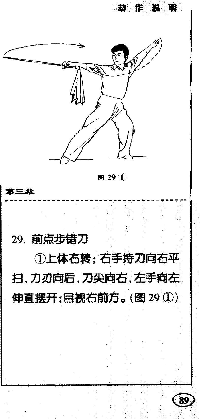 脚向右脚前方上步,脚尖点地成前 点步;右手痔刀直臂向右推出,左手 屈肘回带盘于左侧,拳与同同高,拳 心向前;目视右前方◎(图29③)