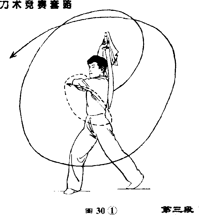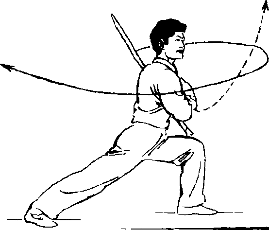 屈肘收回,平置于身体右侧,刀刃 向前,刀尖向右,左手变郸8之向