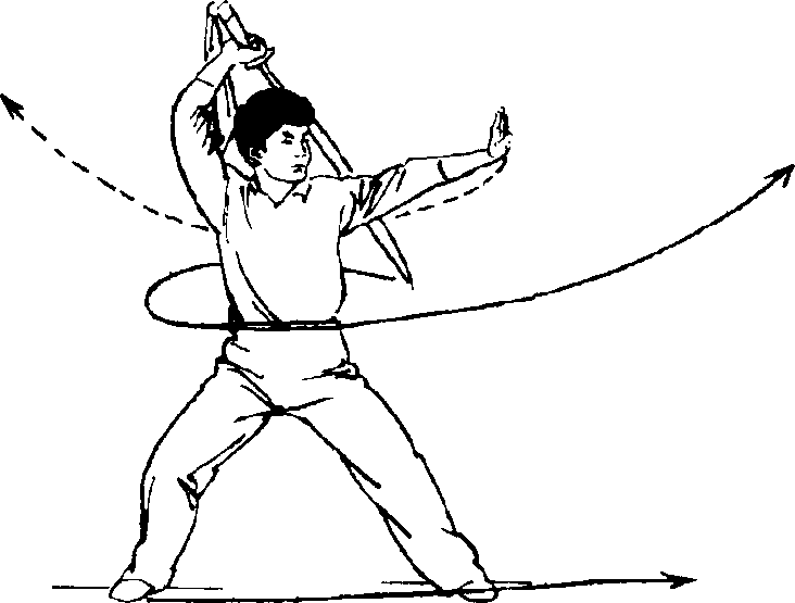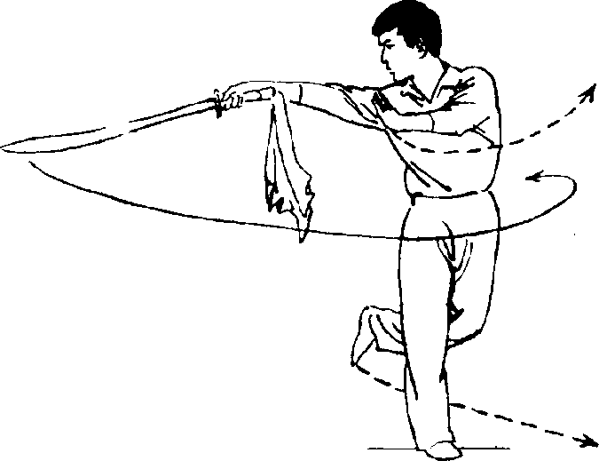 ①上体向右后转;右脚向右前方上一步;右手持刀随臂外旋收至 腹前。(图36①)BH 362BH 362BH 362BH 362②右手持刀向上、向左沿体前 绕行一周后向右侧点击,左手向下经腹前向上、向右摆至右胸前成立掌;目视右前方。36②)国37① 第三既