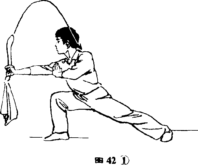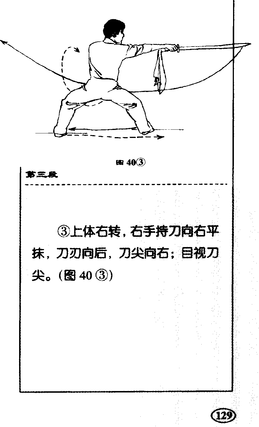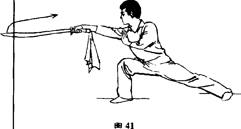 ②身体右转,右脚向后退一步;右手持刀臂外虹举,向后经 背部向左扃绕行,如贴胸,刀尖向后,左手屈时收至胸前0 (140②)刀术克安套路4双脚同时蹬地微离期面,在空 中向左后方转体,落地成右弓步; 右手持刀臂内旋向下;向左经腰前 向前立刀扎出,左手向下、向左摆 动,屈肘收至右上财稣目视右 前方0 (图41)a作 > 明a作 > 明a作 > 明a作 > 明