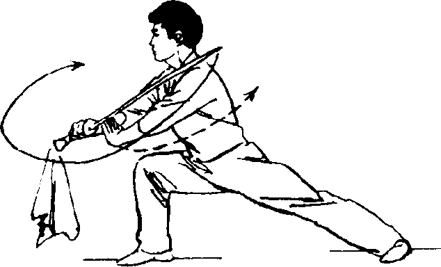 刀刃向右,左手同时向左伸直分