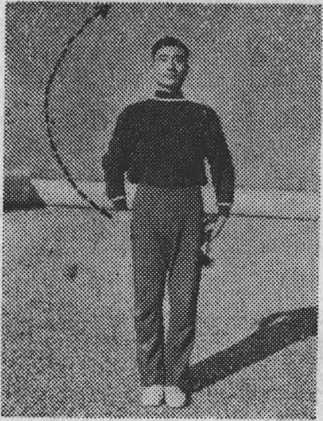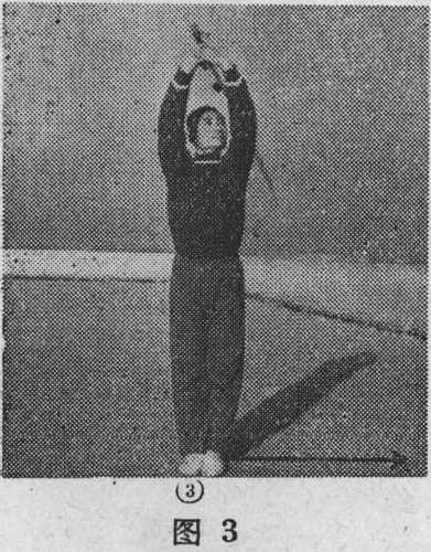 动作:①左脚向前上半步,膝略屈;右脚不动,膝部伸 M;右掌同时从身前向身后弧形下沉,至身后反臂斜举(图 3之①);②右脚前进一步,膝略屈;左脚不动,膝部伸