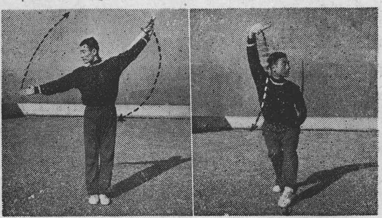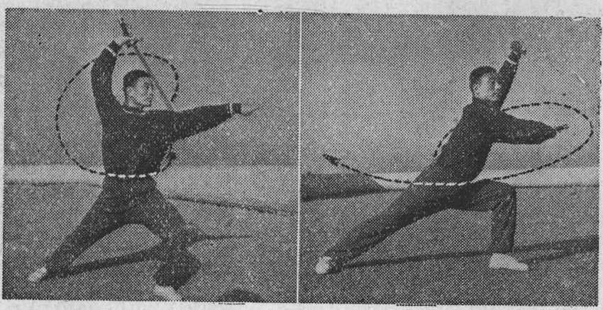 由身前屈肘从右臂里面向上直臂穿 出,手心朝右;目祸右手(图2之 ②);③右手从左腋向下、向右弧形^ 环;左手握刀和右手同时相应地从上 向左、向下强形^环;目随右手(图, 2之㈤);④右手向上^环,至 头1M时屈腕成横掌,屈肘横架,掌心 朝前;左手握刀向下向身后^ 环,至身后反臂斜举,手心朝右;右腿在右手成横掌之同时 屈膝半蹲;左脚刖随之向身前伸出,以脚前掌虚沾地面,膝