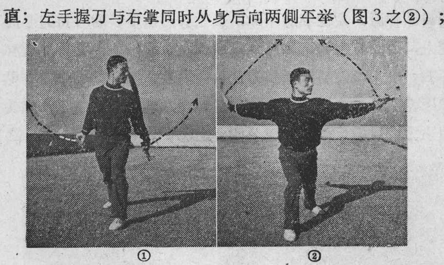 动作:①右腿屈膝略蹲,左脚向左出步;右手持刀使刀 背^身从左^向身后;左臂内旋使左掌拇指一倒1朝下向左伸 出,掌心朝后;.向左平5S (图4之①);②上身左^,右