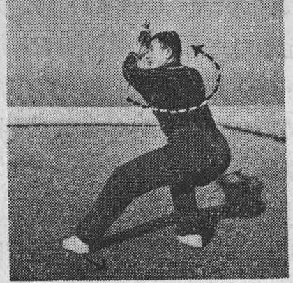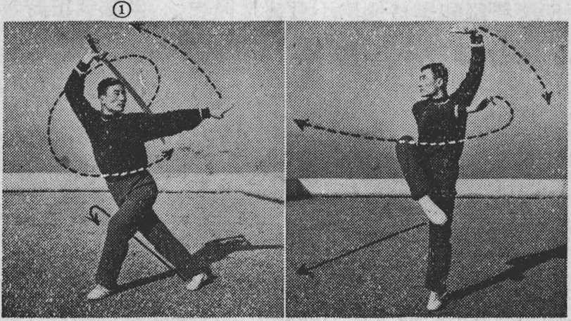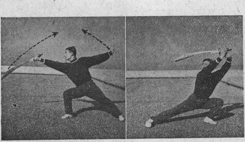 动作:①右手持刀臂外旋屈肘使刀刃朝上,刀尖稍向下 斜垂(图【4之①);②左腿屈膝全蹲,右腿挺膝伸直平