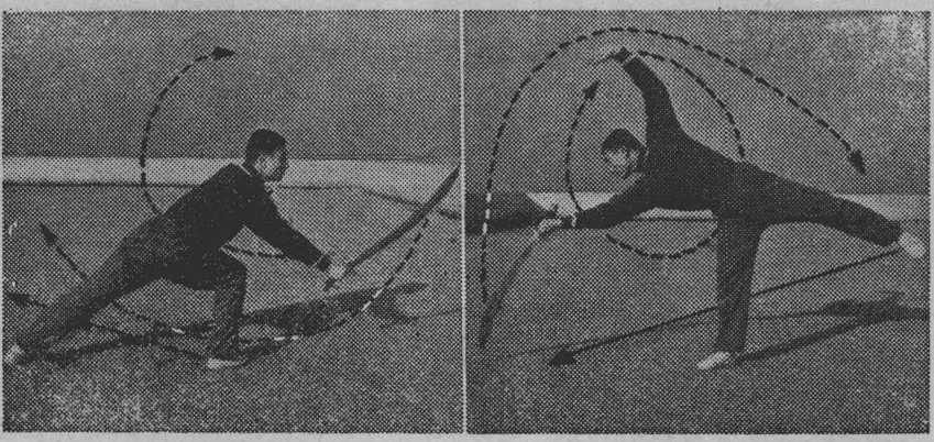 下、向前^环撩起,刃刃朝 上(图29之②);③上身 从左向后左脚向左后方 落步;左腿屈膝全蹲,右腿 伸直平成仆步;上身向 右前方探伸;右手持刀在^ 身落步之同时从上向前劈 下;左掌随之向下、向后、