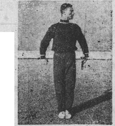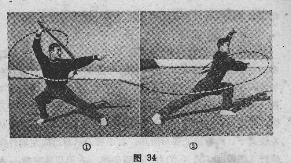 动作:①上身右魂。左腿伸直,右腿屈膝;右手持刀手 '心朝下向右平扫,左掌随之向左平伸;目祸刀尖(图35之