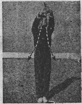 图35 /图35 /①);②J慎扫刀之势右臂外旋手心朝 上使刀背向身后平摆(图35之②); 句右腿伸直,左脚向右脚M,并步 直立;右手持刀刀尖朝下,刀背^靠 脊背,向?8前上方举起;左掌同时也 向SR前上方举起;在额前,左掌拇指 张开用掌心握住刀把准谷将右手之刀 接回;目祸右手(图35之③)。