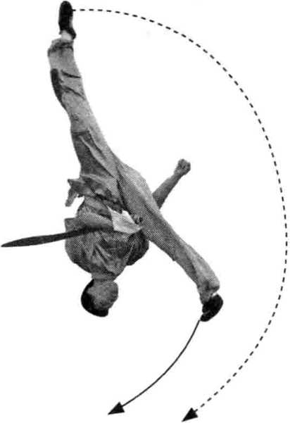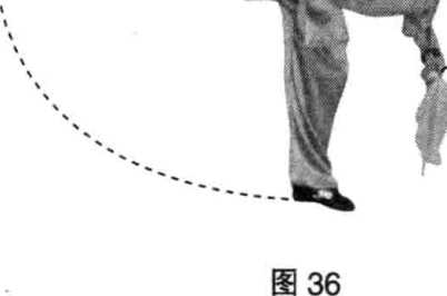 屈;随即右、左腿依次离地从后向上立圆摆起,在 空中做向左侧翻动作;同时,左手握刀收于腰间, 右手摆动至身体右侧;目视下方。(图36、图37)