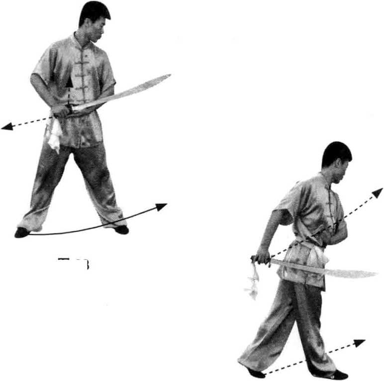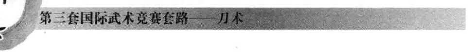 (1)接上势,上体立起左转,右、左脚依次 向前落步,右手接刀;随即右、左脚连上3步, 身体继续左转,两腿屈膝半蹲;同时,右手握刀