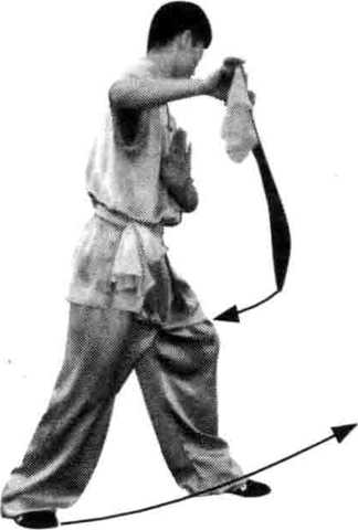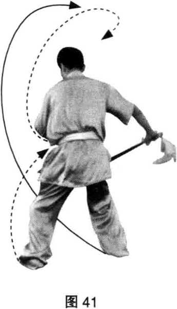 目视左下方。目视左下方。顺势摆至右侧,左手附于胸前; (图 38—图 41)