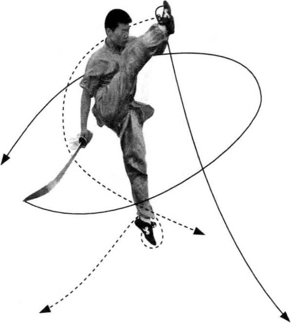 (2)右脚蹬地起跳腾空,左腿向左上方摆起, 右腿里合;同时,左手在头前迎击右脚掌,右手握 刀向右斜下方劈砍;身体左转一周;目视里合脚。 (图 42)