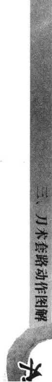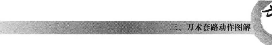 (1)接上势,左脚向左侧落步;右手握刀 收于头部左侧,左掌收于右肩内侧;随即身体 左后转360。;右脚经左腿前向左侧横上一步, 左脚向后退一步;同时,右手握刀连续2次缠 头刀于右前方平摆,左掌伸向左后方;目视刀 尖。(图50—图52)