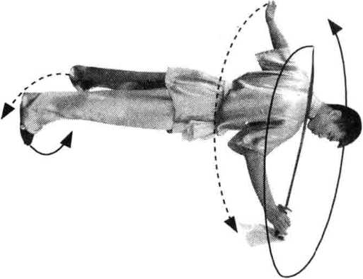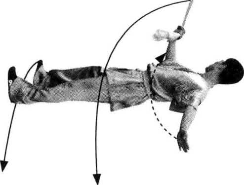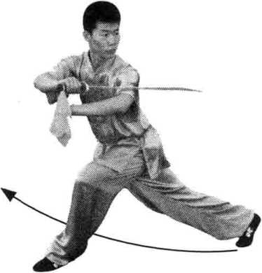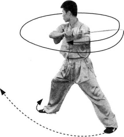 “ (2)身体继续左转,右脚倒播步;同时,右手