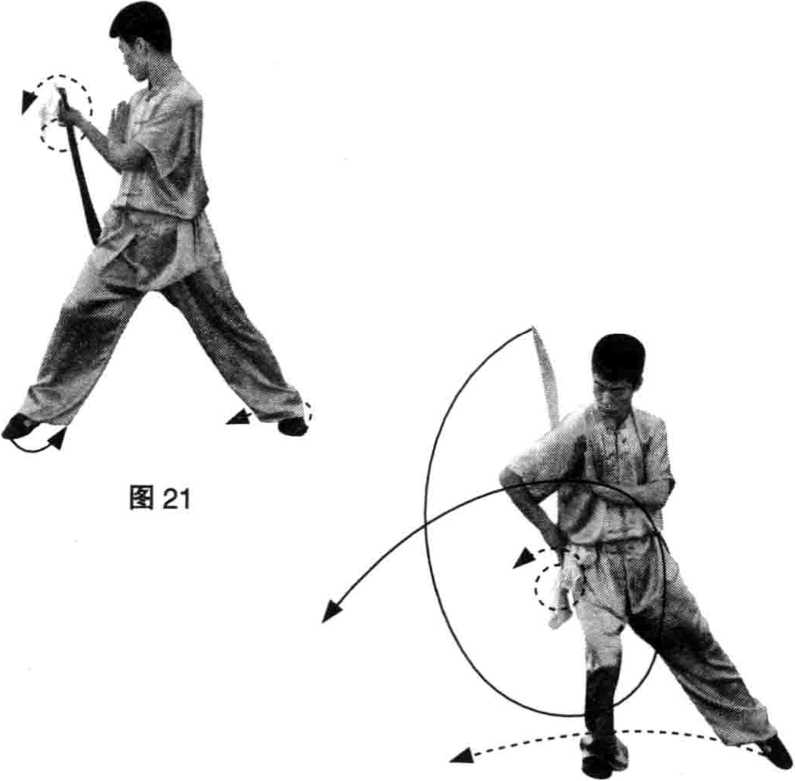 (1)接上势,身体右转,重心右移;右脚尖向 右碾转,左脚微收回;同时,右手握刀在右后方背 花刀,左掌顺势收于右胸前;目视右下方。(图 21、图 22)