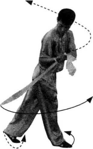 (2)上体左转拧腰,左脚倒插步;同时,右手 握刀收于腰间,左手附于右腕内侧;目视刀身。 (图 23)