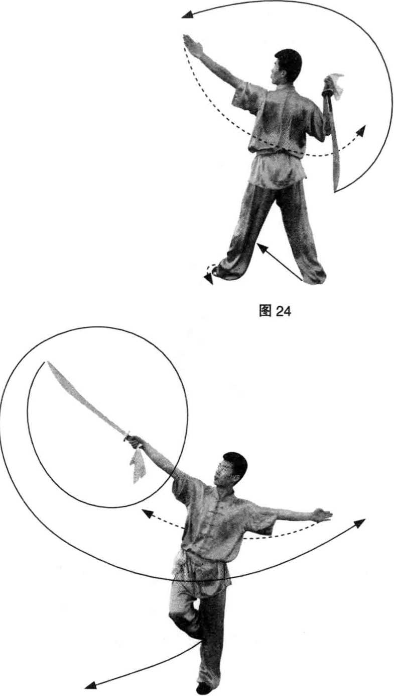 (3)身体向左后转360。;两脚向左碾转,随即 右脚扣在左膝胴窝处;同时,右手握刀在右上方左 剪腕花,左掌由上向下、向左侧水平伸出;目视刀 尖。(图24、图25)