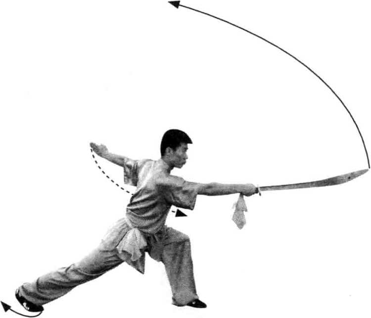 步;同时,右手握刀经腰间向左前方平扎刀,左掌 向左斜后方水平伸出;目视刀尖。(图26)