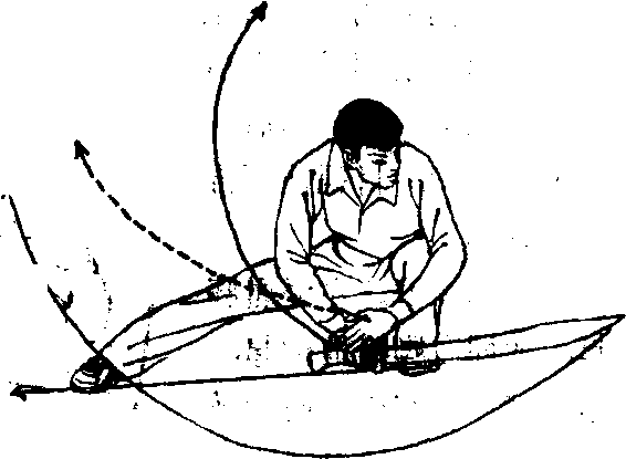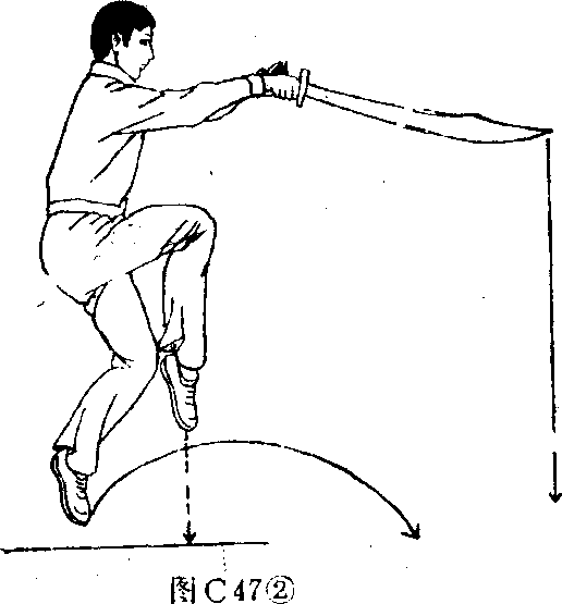 点,力达刀尖,两臂伸直,刀柄略高于刀尖,刀刃朝下。目向 前平视(图C 47②)。