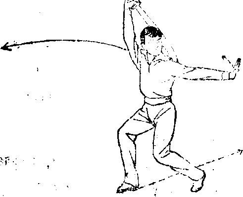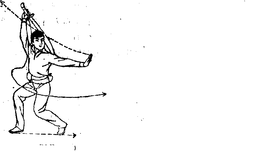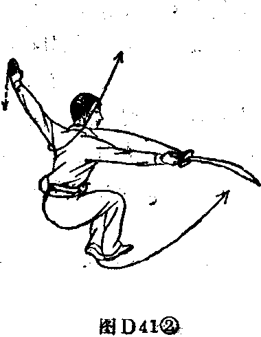2 右脚向左脚内侧上步,左脚 尖点地,两腿屈膝半蹲成丁步。同时,右手持刀由左肩贴后背 向右肩做缠绕后,离右肩,臂下落手心向上,以刀刃领先,随 转体由右向前、向左下方扫刀,刀刃朝左I左掌芈摆至左斜上 方*掌指那上o眼糠刀走,目视扫力(图D41②八