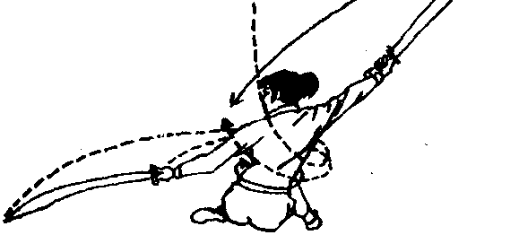 2.上动不停。体继续左后转180度,左脚于右脚前落步,脚 尖外展,两腿交叉叠拢下坐成坐盘。同时,右手持刀以刀刃领 先由后背向右斜上方斩刀,手心向上,刀刃朝前;左刀臂外旋 随转体经前平绕至体左侧,手心向上,刀刃朝前,刀身斜下 方。目视左刀(图E 25②)。