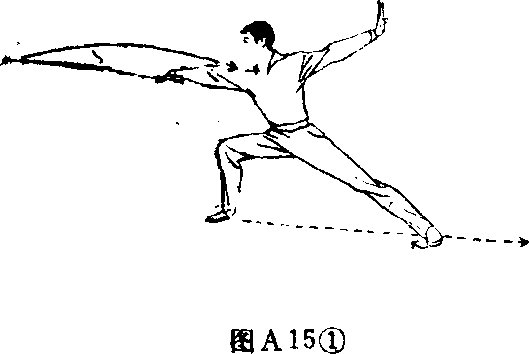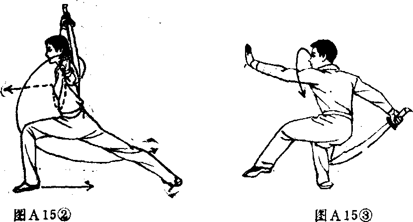 L右手持刀臂内旋,手心向下,以刀刃领先使刀由前向右 后平扫斩击,体随郎右后转手左掌从上向左下落,掌指朝上。 同时,右腿屈膝半蹲;左腿挺膝蹬直成右弓步。眼随刀走(图 A15 ①)。