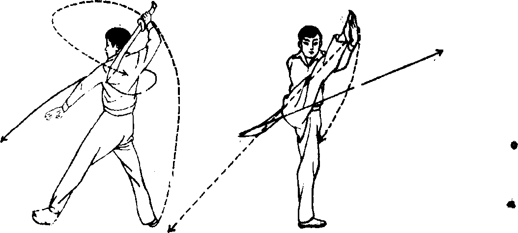 要点:此动作要先做缠头动作,后做里合腿。缠头以刀背 贴身绕行;里合腿时要松靛,经额前时向体左侧成扇形摆动落 下。击响准确、响亮。