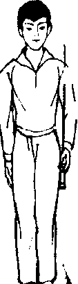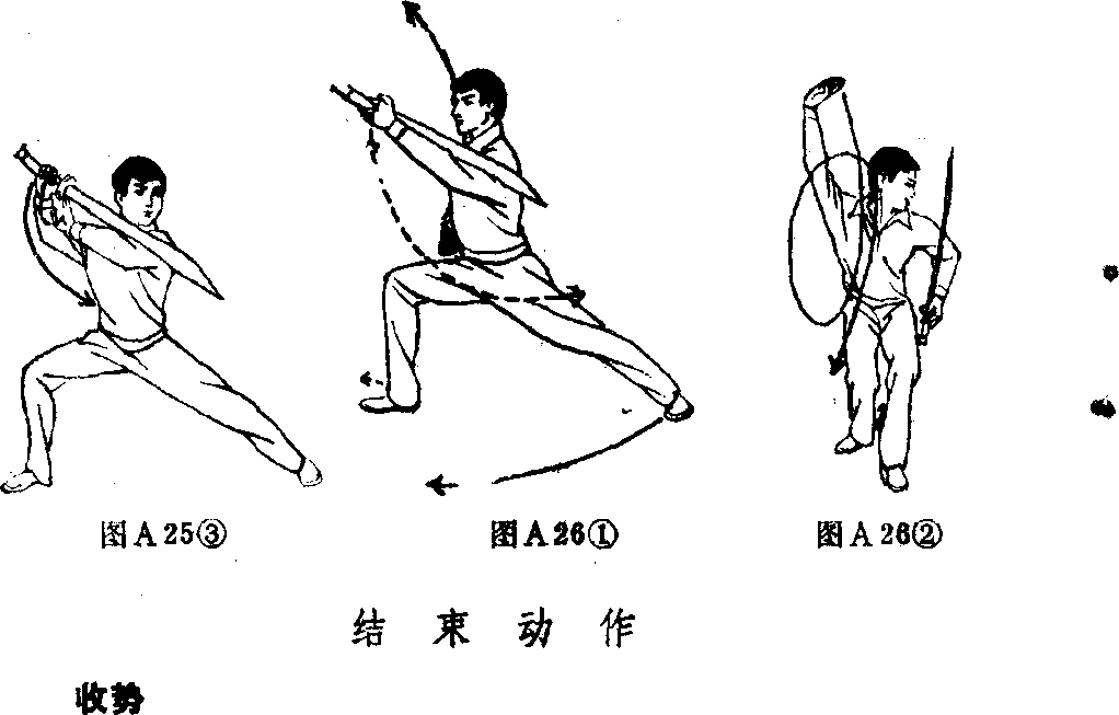 左脚向后退一步, 拢,两腿直立。同时, 1\再向右下方直臂摆动, 力下按落,垂于体右侧孑 前平视(图A27)。