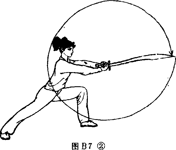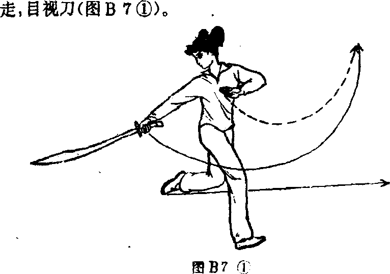 L重心移至左腿,右 腿提起;左脚随即蹬地跳 起,屈膝停于体后;右脚 前落。同时,右手持刀以刀刃领先直臂向下,向前经头上方、向后平劈时,体右彷 n与管平,刀刃朝下;左掌屈肘下按于胸前,掌心向下。眼随刀2.上体左转,左脚向前落步,屈膝半蹲;右腿挺膝蹬直成 左弓步°同时,左掌直臂由胸前向下摆至体前方,右手持刀直 臂由后向下,经体右侧向前反撩,刀与臂平,刀刃朝上,手心向上;左掌顺势附于右手刀把上,掌心向下。目视前方(图B ’7 ②).要点、撩刀与弓步要同时完成。撩刀时要贴体右侧弧形撩 出,力达刀刃前部。