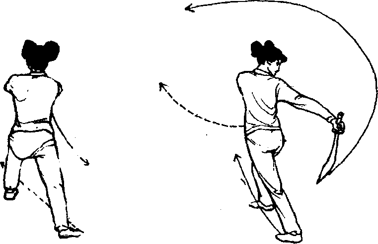 1 .右脚向前上步,膝略屈,左腿挺膝伸直。同时,右手持 刀向下摆至体右侧,刀刃朝右,刀尖朝下;左掌向右停至右胸 前。目视右手(图B 34①)。图B33 图B34①2 .上动不停。重心移至右腿,左:抱屈膝提起成左提膝。同 时,右手持刀臂外旋,使刀向上至头右上方时屈腕,刀身横架 禾头上方,刀刃朝上,刀尖朝左;左掌向下,向左直臂摆至体 左侧平举成立掌。目向左平视(图B 34②)。要点:提膝架刀与向左甩头要同时完成。