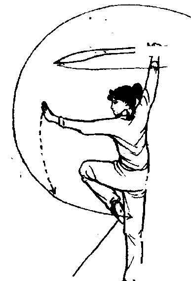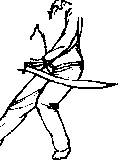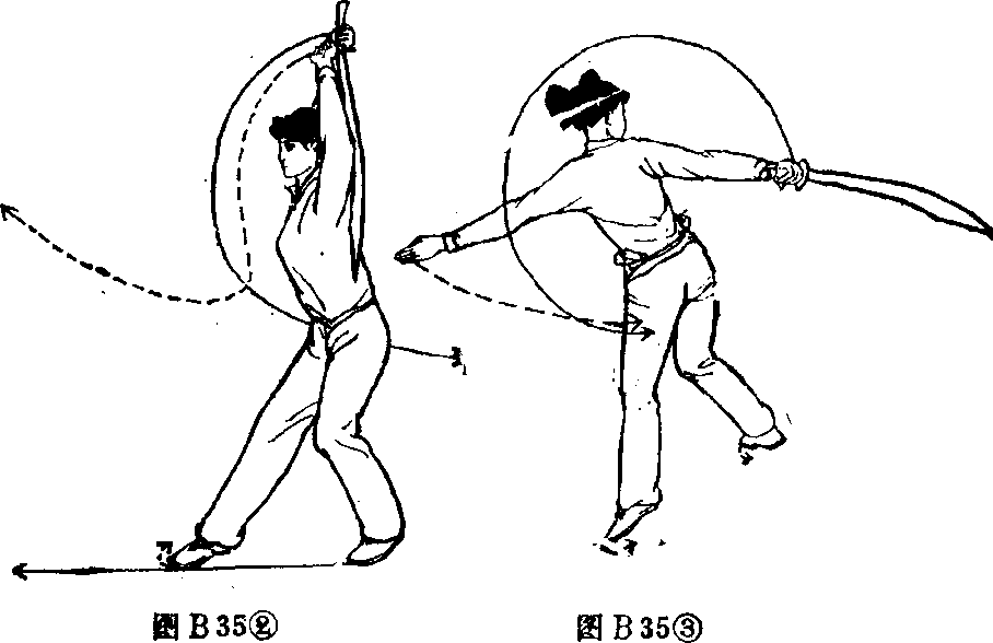力背顺左臂贴左肩外侧绕向身后上提,刀尖朝下;左掌随之上 举。目视前方(图B 35②)0
