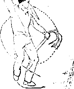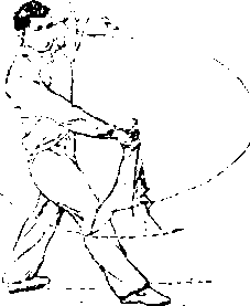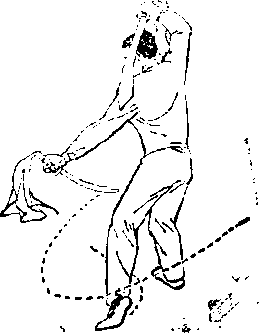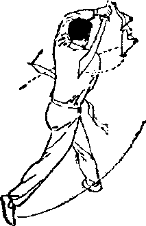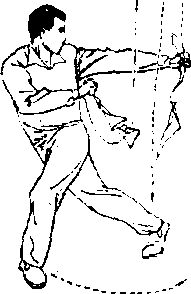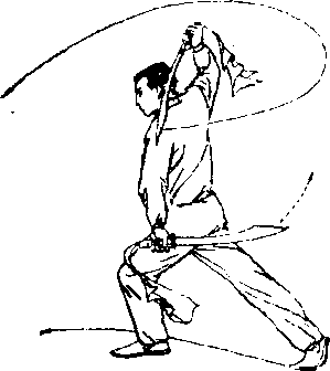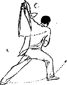 (7) 图 B-11?图 B-11?上动不停,左脚向左 前弧形上步,左腿屈膝j右脚 跟提起3右刀背绕左肩至背 后3左刀以刀刃向前、向左、 向后下扫,随之左臂外旋,手 心朝上,刀尖朝后5眼视前方 (图 B—11 ⑦)o