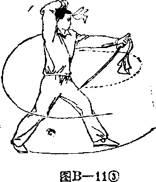 (3) 上动不停,左脚向左 前方弧形上步,左腿屈膝,右 刀以刀刃继续向前、向左扫至 左腿外侧,右臂内旋,屈肘上 提,刀背贴体左侧上提,沿左 肩向背后缠绕,刀尖向下;左 刀背贴背部绕过右肩,以刀刃 向前扫出,置体左,刀刃朝斜 前,刀尖朝下3眼视左刀(图 B—11 ③)u