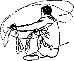 图剪一17图剪一17以两脚脚掌为轴,身体继 续向左旋转半周% I?转体两腿 交叉叠拢下坐,左腿在上,臀 部和右腿大、小腿外侧及脚而 着地,左腿大腿贴近胸部,成 坐盘j随转体两刀继续向左旋 扫,至身体左侧'将刀尖后用8