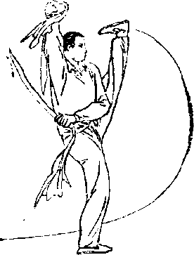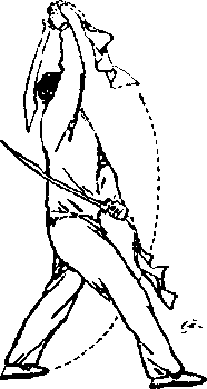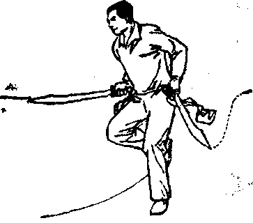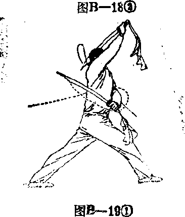 图B-19国图B-19国右腿伸直,左刀以.刀刃向 右、向前、向左反乳至身- 体左侧,臂伸直外旋,使刀 《 刃朝下,刀尖向前3右臂下 落于身体右后,使右刀娘势 下带至身体右侧,刀刃朝 " 下,刀尖朝前下方J眼视左 刀(图B—19②)。