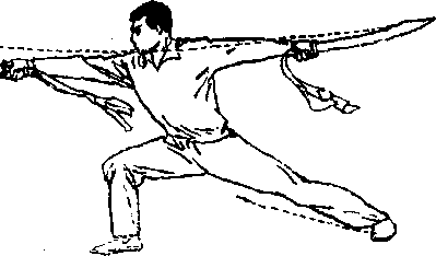 指侧屈,使刀尖向上,再向左 扎出,刀刃朝下,高与肩平; 眼视右刀(图B —19④)。