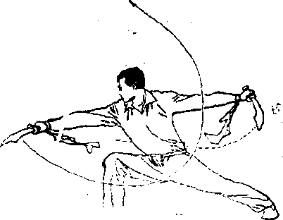 立抡,手心朝前,刀刃朝右* 刀尖朝上3左臂屈肘下落,使 左刀向下、向后、向右落置身 后#手心朝后,刀刃朝下,刀 尖向右?眼视右刀(图B—32 ①)◎